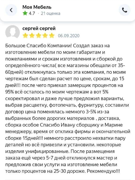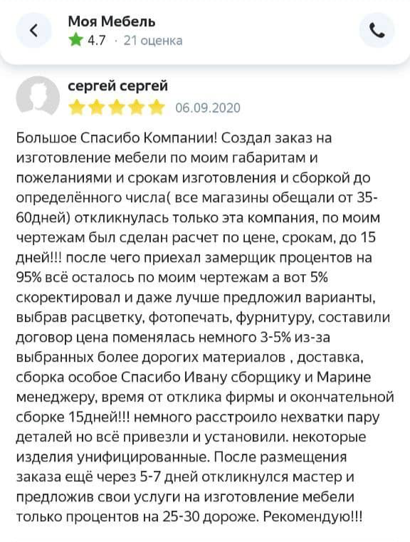 Меня зовут Марина и я уже более 15 лет работаю главным технологом на фабрике Моя Мебель. За это время мы выработали уникальную систему производства корпусной мебели без сколов и с минимальными допусками. Я с радостью помогу Вам подобрать мебель под любой интерьер и любых размеров. Наши курьеры поднимут изделие на Ваш этаж, даже если лифт не работает, а сборщики установят все за один день, без пыли и мусора.